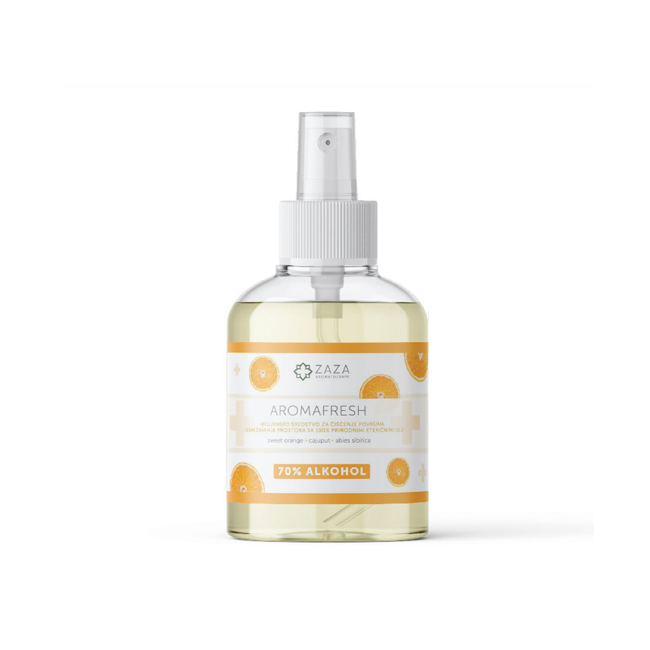 Aromatično higijensko sredstvo za čišćenje tvrdih površina i osvežavanje prostora sa 70% alkoholom i prirodnim eteričnim uljima narandže, kajeputa i sibirske jele.